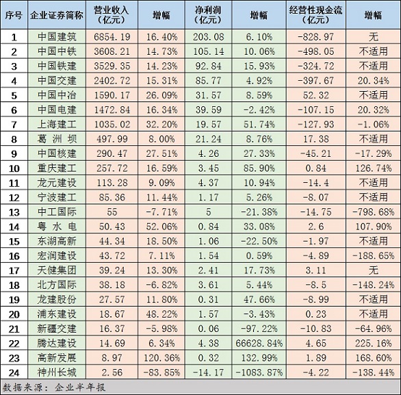 典型建筑業(yè)上市企業(yè)半年報透視:營收、凈利潤總體保持雙增長,“強者恒強”趨勢凸顯