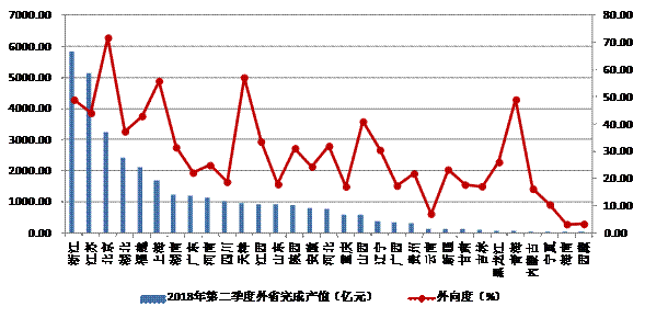 圖4  2018年上半年各地區跨省完成的建筑業總產值及外向度